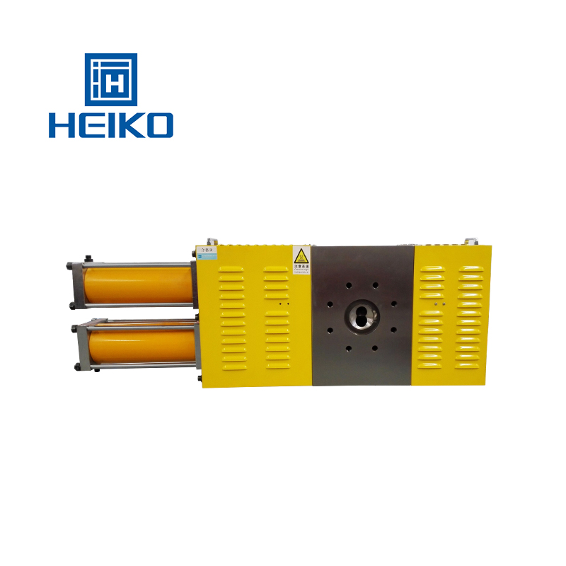 液壓驅動板式快速換網器操作說明:滑板上設計兩個可拆卸式的過濾工位,工作時,一個過濾工位在主體內部進行熔體的過濾,另一個工位在主體外部備用(滑板上設有不銹鋼加熱棒進行加熱保溫,保證和生產溫度的相近)。當工作中過濾網上的雜質積累到一定程度時,需要換網,即可按動液壓站上的操作手柄按鈕,啟動蓄能液壓站進行換網動作。
